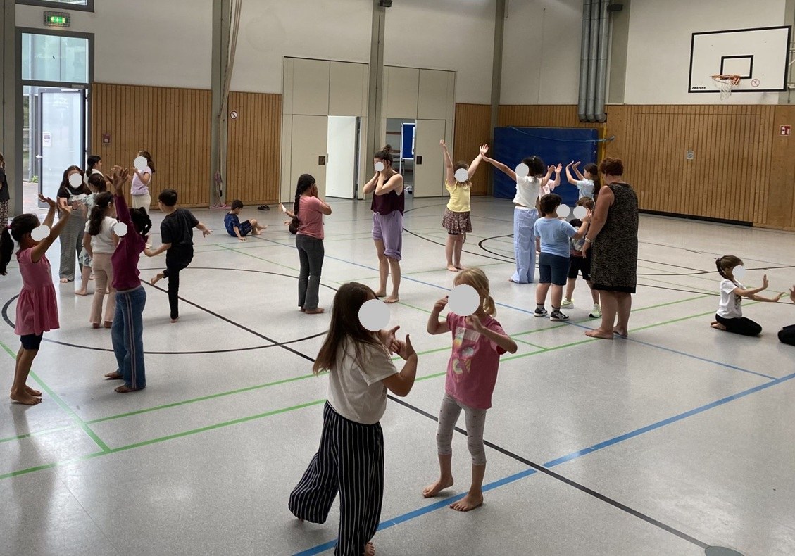 Gruppendynamische Übungen und Spiele ermöglichten ein selbstständiges und respektvolles Arbeiten in großen wie kleinen Gruppen. Die gesamte Gruppe erlernte unter anderem eine Partner-Choreografie. Im kreativen Prozess wurden verschiedene Tanzsequenzen entwickelt, bei denen auch Requisiten wie Tücher, Bücher und Regenschirme zum Einsatz kamen – ein Element, das bei den Kindern besonders gut ankam. Zur inhaltlichen Vertiefung brachten die Dozierenden ein Kinderbuch zum Thema Kinderrechte mit,welches gemeinsam mit den Kindern gelesen und reflektiert wurde.